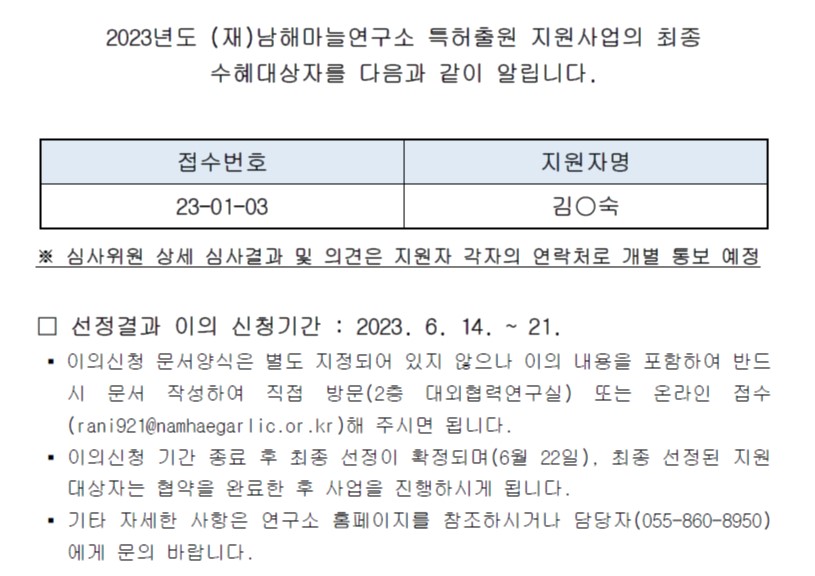 2023 남해마늘연구소 특허출원 지원사업 최종 수혜대상자 선정 결과 알림