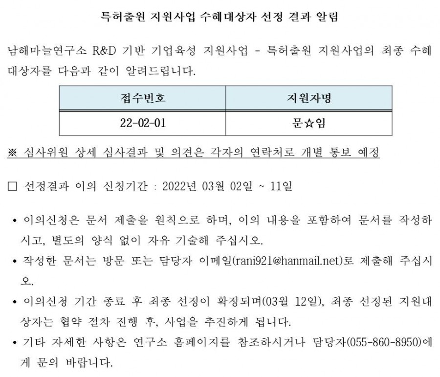 2022년 특허출원 지원사업 수혜대상자 선정 결과 알림