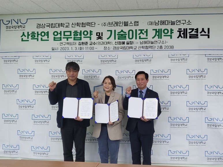 2023년 1월 3일 경상국립대학교 산학협력단 기술비즈니스센터에서 경상국립대학교, (재)남해마늘연구소, (주)브레인헬스랩간의 산학협력 업무협약 및 기술이전 계약 체결식이 개최되었다.