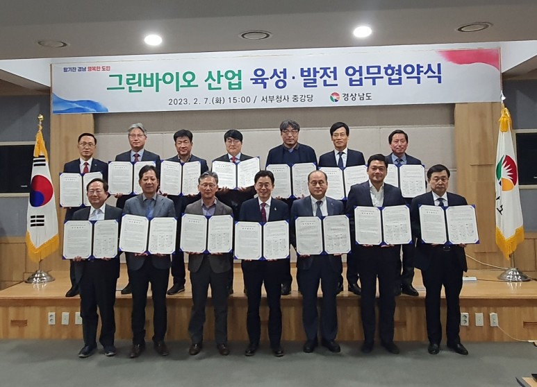지난 2월 7일 경상남도 서부청사에서 경남도내 그린바이오산업 관련 연구기관을 포함한 기업육성 지원기관, 행정 등 총 14개 기관이 업무협약을 체결하였습니다.