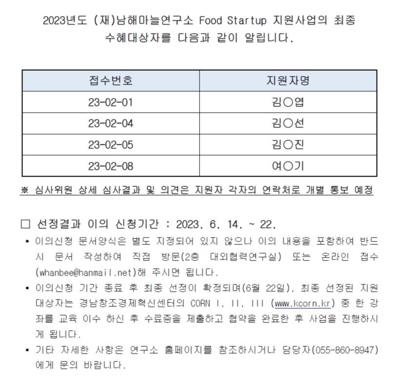 2023 남해마늘연구소 Food Startup 지원사업 최종 수혜대상자 선정 결과 알림